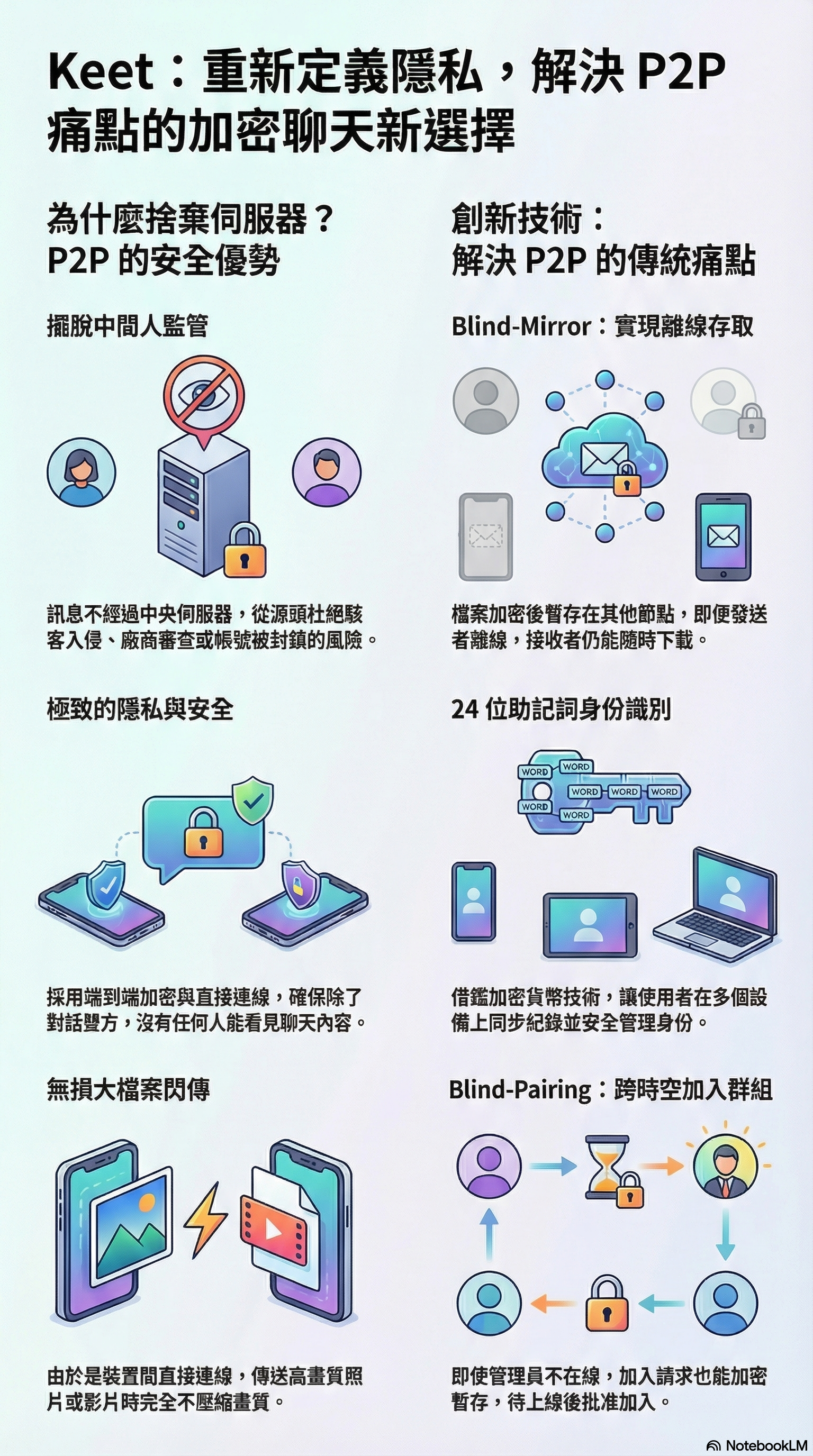 - 解決「不在線就不能用」的問題:Keet 使用了 Blind-paring 和 Blind-mirror 技術,訊息或檔案可以先加密存到其他節點,等朋友上線時再處理。